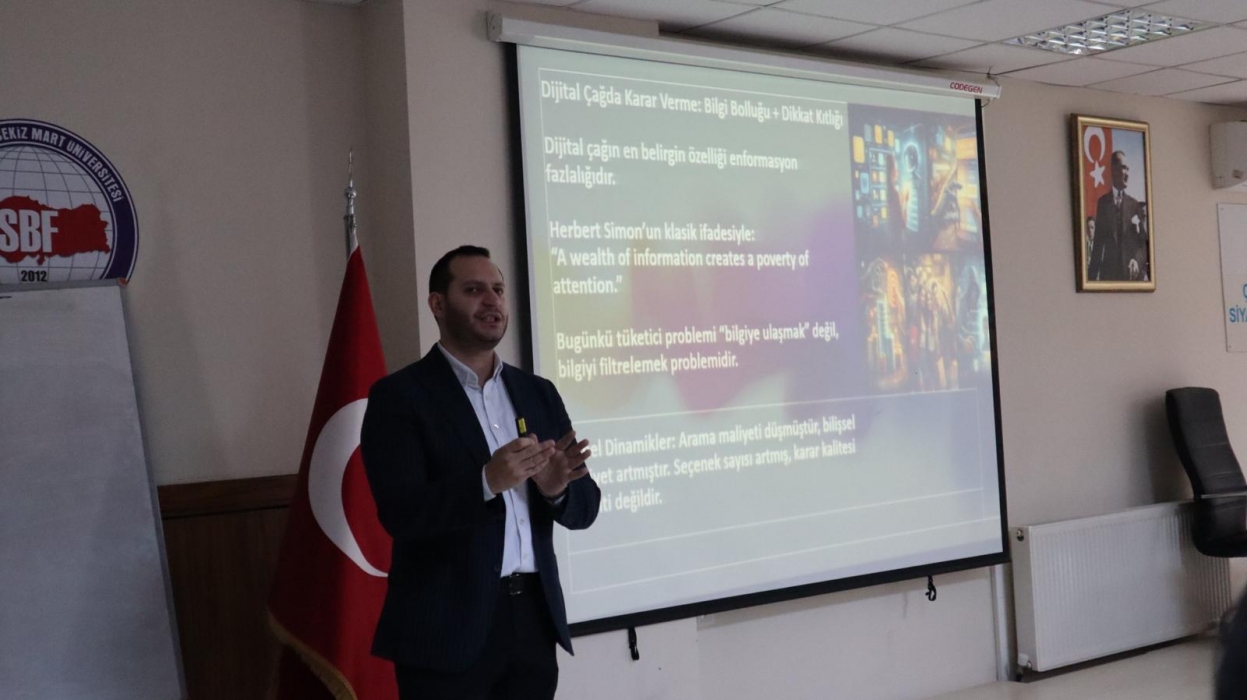 Akademik personelin yanı sıra öğrencilerin ilgi gösterdiği etkinlikte, dijital dönüşümün karar alma mekanizmaları üzerindeki etkileri çok boyutlu bir bakış açısıyla ele alındı. Konferansta, veri temelli yönetim anlayışının yükselişi, yapay zekâ destekli analiz yöntemlerinin stratejik karar süreçlerindeki rolü ve dijital platformların tüketici tercihlerini nasıl şekillendirdiği güncel örnekler üzerinden değerlendirildi.